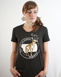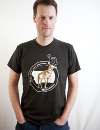 This high speed ungulate is second only to the cheetah in vigorously moving itself along the terra, man. We think they're incredible creatures, and shucks, here's to 'em! We've got Men's Small through XXL and Women's Small through Large. These are printed on American Apparel Tri-Black Track Shirt 50/25/25 blend.